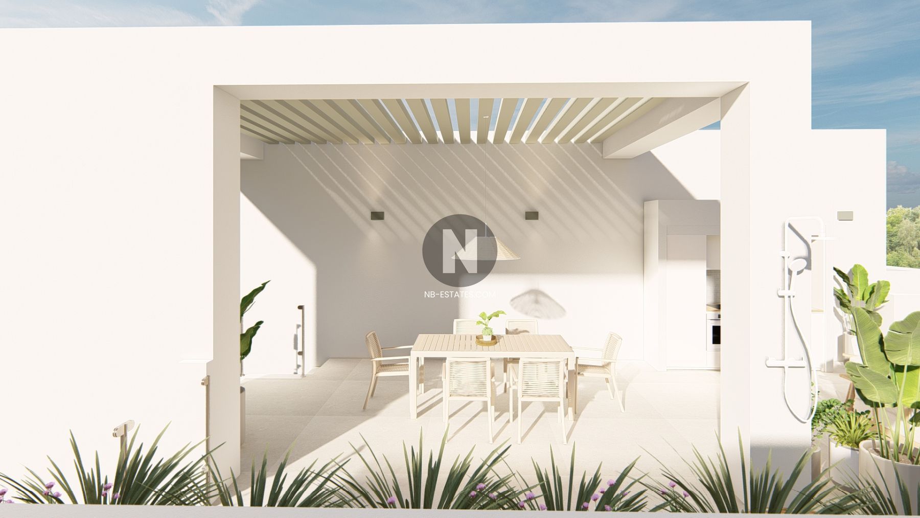 El complejo residencial está diseñado como una urbanización privada con amplias zonas exteriores y áreas comunes pensadas para el descanso y el ocio. En el centro del residencial se encuentra una gran zona de piscina con diferentes espacios para relajarse y disfrutar del clima mediterráneo.