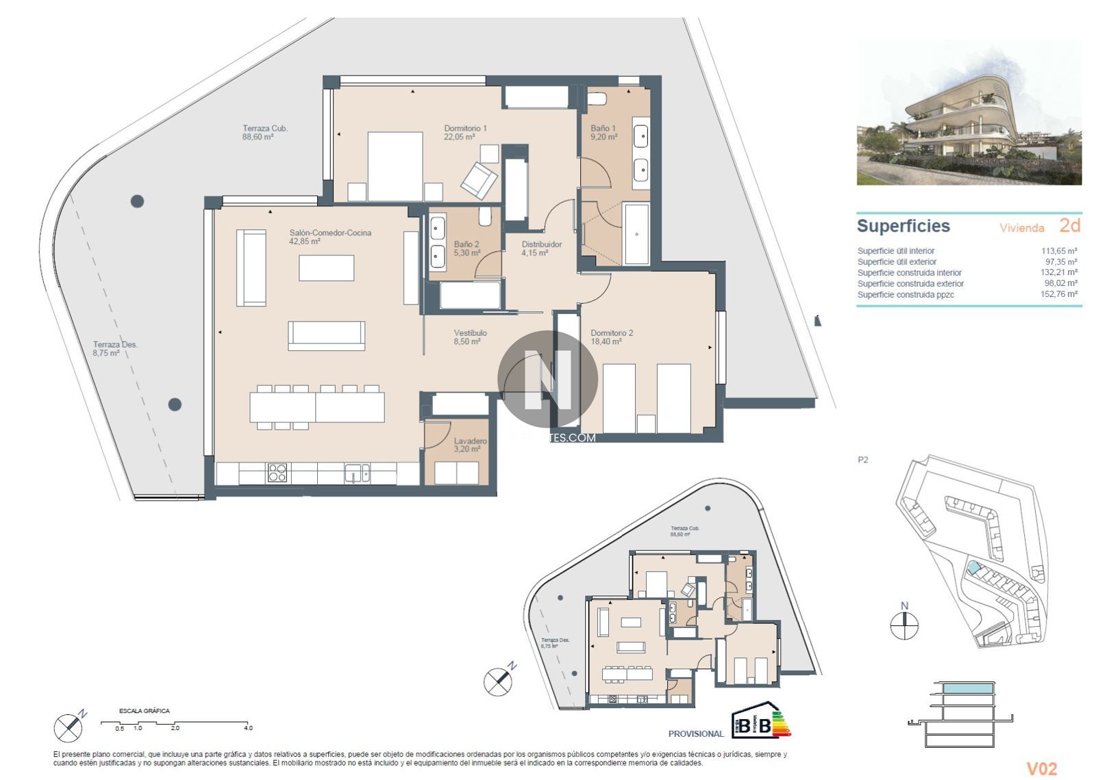 Dit penthouse valt op door zijn royale ruimte. De woon- en eetkamer meet maar liefst 42,85 m², en een aansluitend terras dat de woning omringt van maar liefst 98,02 m². Het beschikt over twee slaapkamers, waarvan één en suite, en een gastbadkamer..