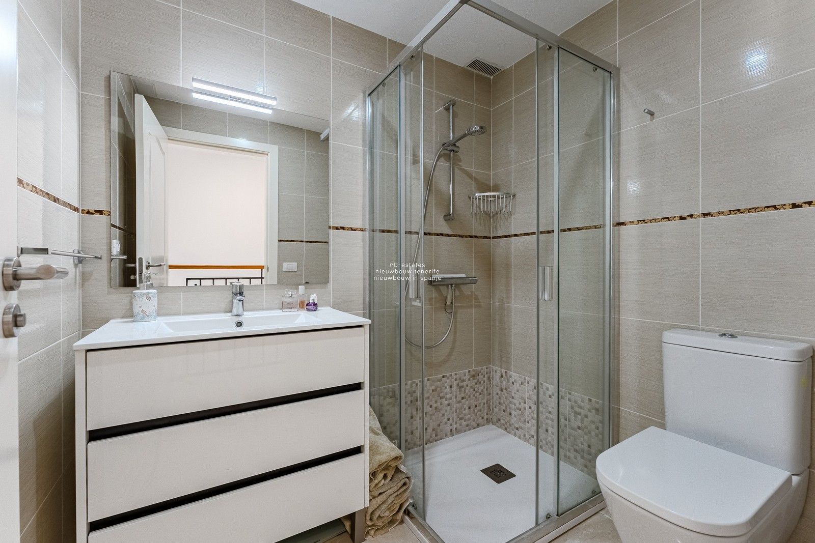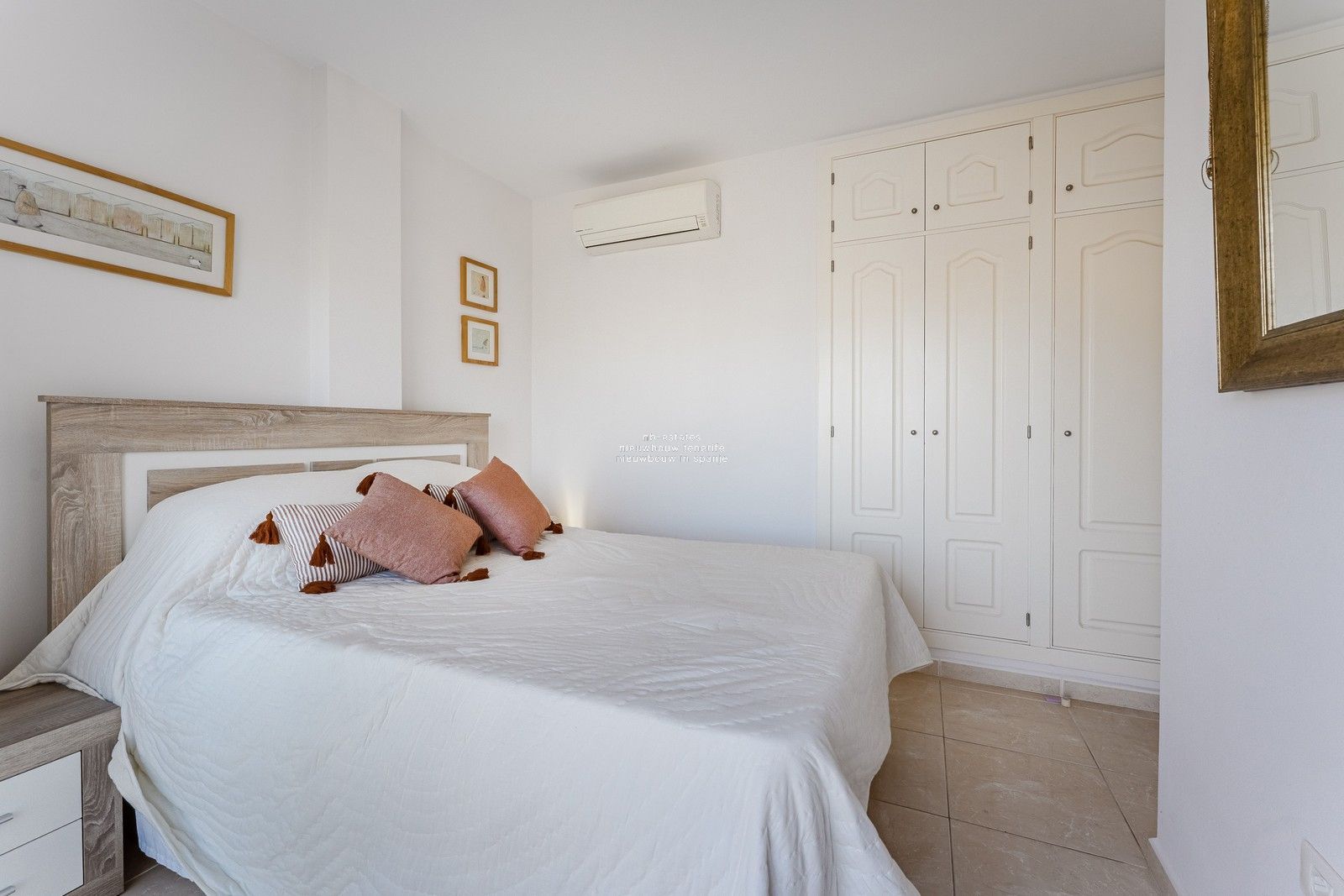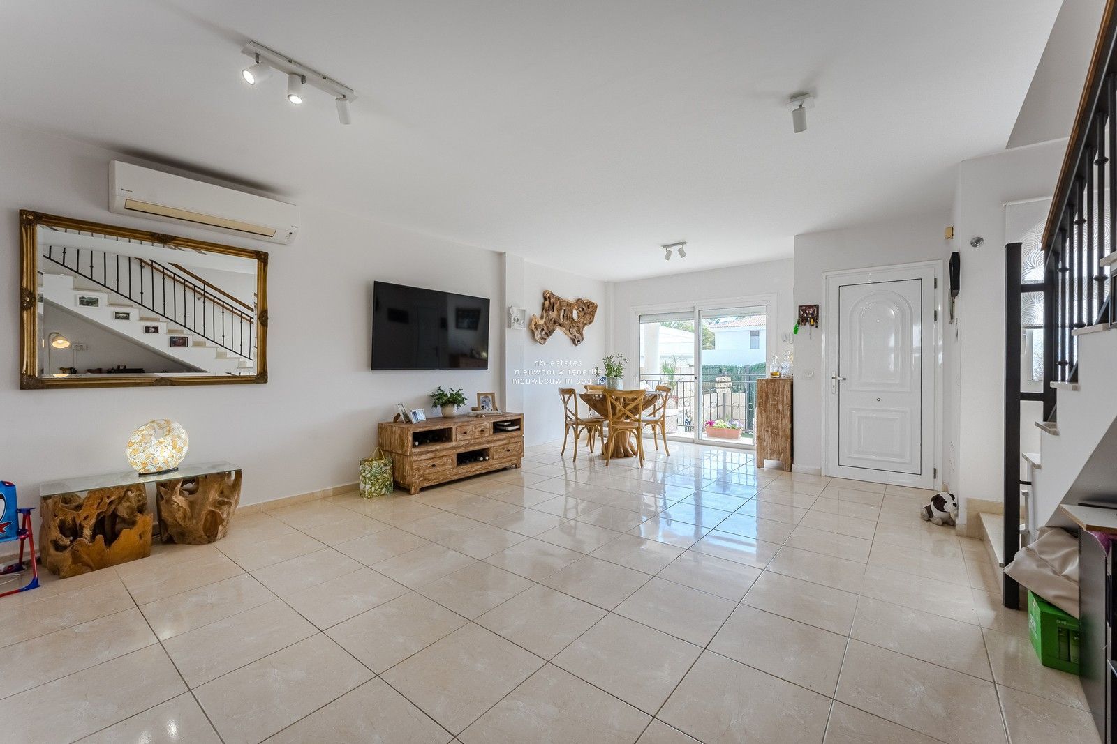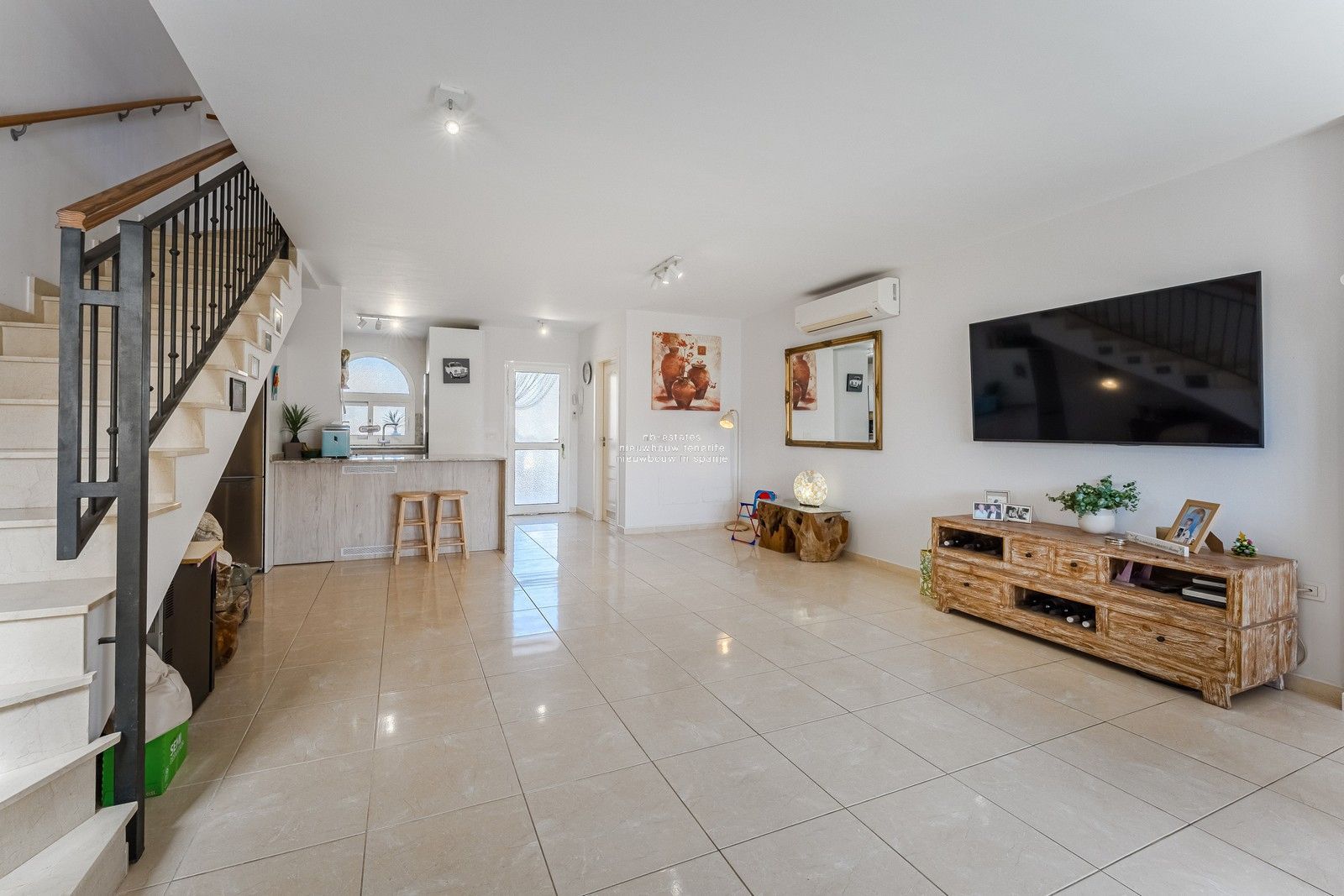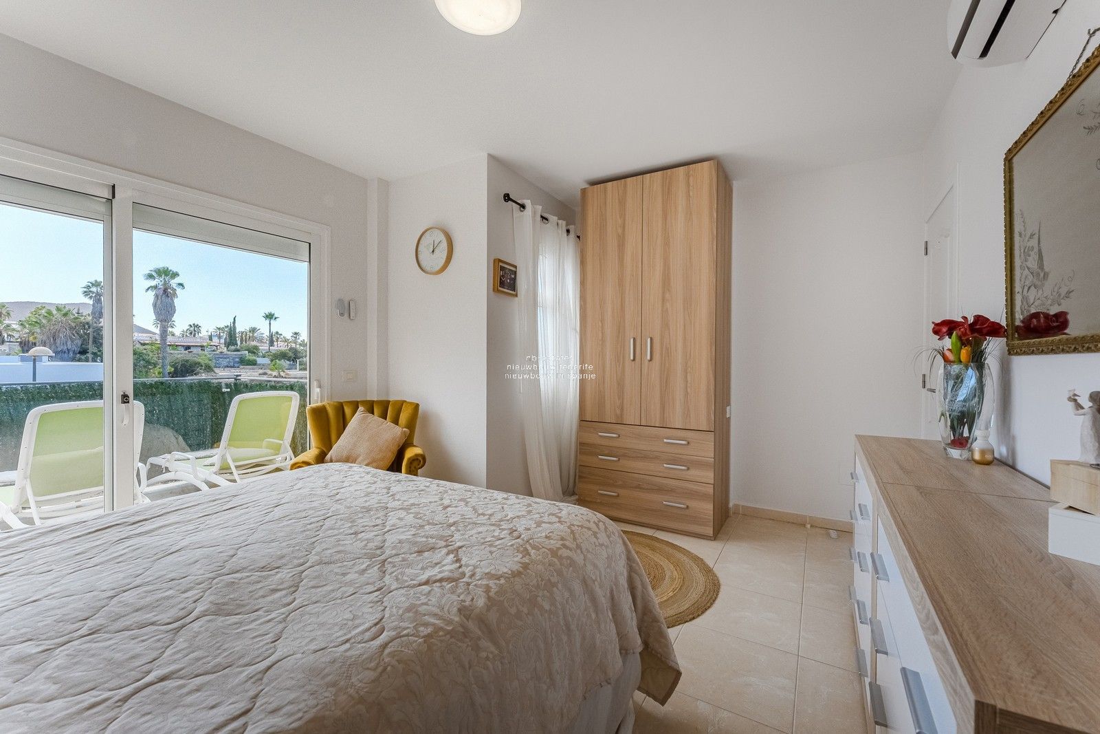 Op de bovenverdieping zijn er drie slaapkamers, twee badkamers en twee open terrassen.